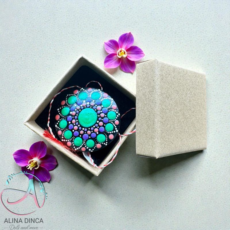 Un mărțișor plin de energie pozitivă, pictat manual pe bază de lemn. Modelul tip mandală, realizat prin tehnica punctului, transformă acest accesoriu într-un simbol al armoniei și echilibrului. Vine gata de oferit, ambalat elegant în cutie cadou.