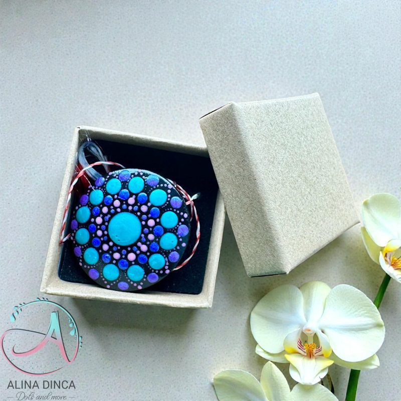 Un mărțișor plin de energie pozitivă, pictat manual pe bază de lemn. Modelul tip mandală, realizat prin tehnica punctului, transformă acest accesoriu într-un simbol al armoniei și echilibrului. Vine gata de oferit, ambalat elegant în cutie cadou.