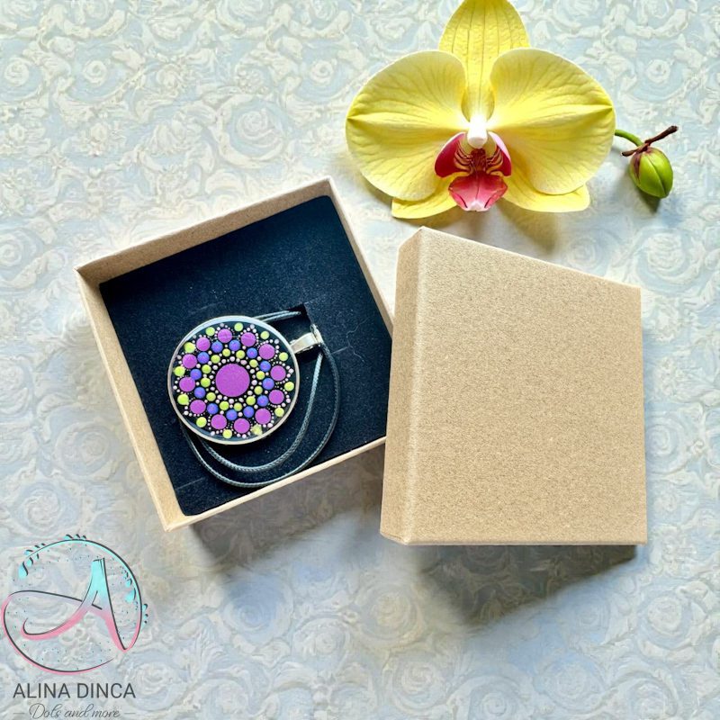 Descoperă eleganța unui pandantiv mandala pictat manual prin tehnica punctismului. Un cadou unicat, protejat cu rășină epoxidică, ideal pentru Mărțișor sau 8 Martie. Vine ambalat în cutie cadou premium. Comandă o bijuterie cu suflet pe AD-Dots.ro!