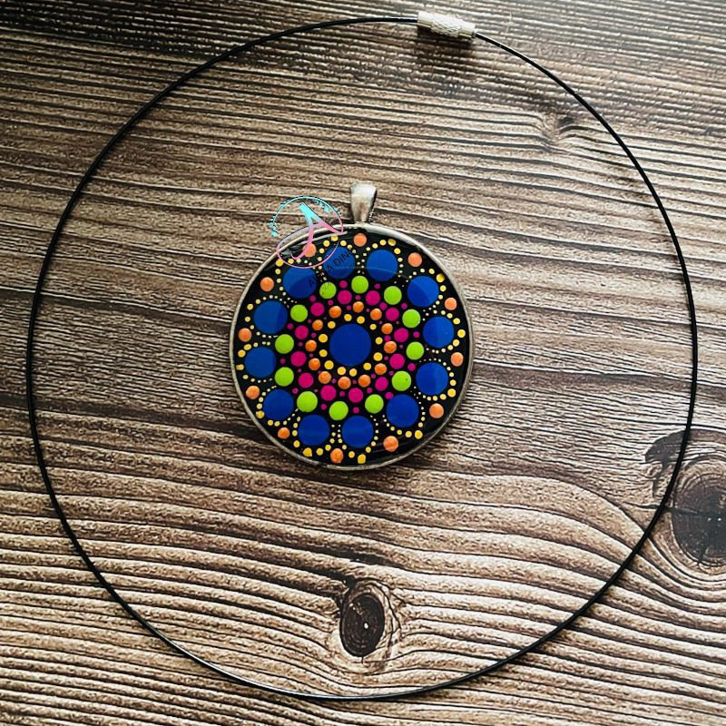 Pandantiv cu model Mandala, din mental, pictat manual culori vibrante, acoperit cu rasina pentru protecție.