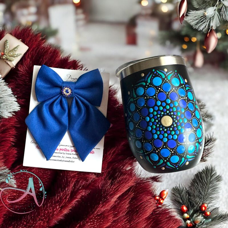 Descoperă un set cadou rafinat, creat special pentru a aduce căldură și bucurie în sufletele celor dragi în preajma sărbătorilor. Acest pachet exclusivist reunește două piese lucrate manual cu măiestrie: un termos pictat cu migală în tehnica punctului și o fundă elegantă.